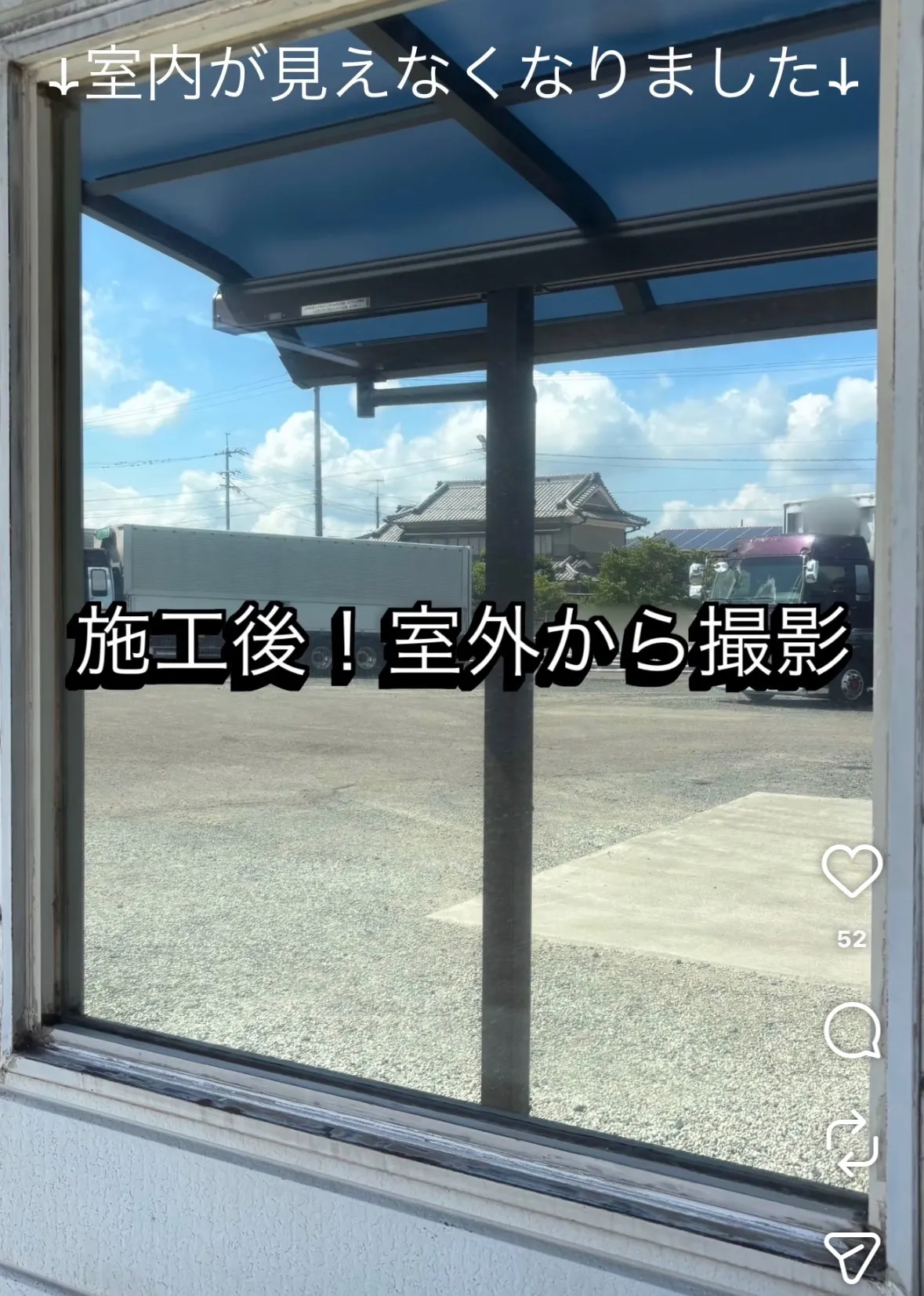 施工前は室内のエアコンや備品がはっきりと見えていましたが、施工後は鏡のようなミラー効果により、外からは室内の様子がほとんど見えなくなりました❣️